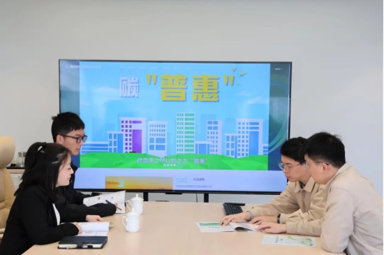 蘇州供電公司碳普惠運(yùn)營團(tuán)隊(duì)成員為客戶介紹一站式碳中和服務(wù)。
