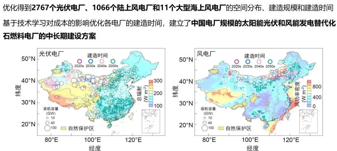 “我們根據(jù)多年太陽輻射和風(fēng)速的小時空間數(shù)據(jù),綜合考慮國家行政區(qū)劃、土地類型、氣候條件、等空間地理信息,同時基于五種不同的電廠形態(tài)分布和電廠各組件成本,優(yōu)化出2767個光伏電廠、1066個陸上風(fēng)電廠和11個大型海上風(fēng)電廠的空間分布和建造規(guī)模,并基于技術(shù)學(xué)習(xí)對成本的影響優(yōu)化各電廠的建造時間。”