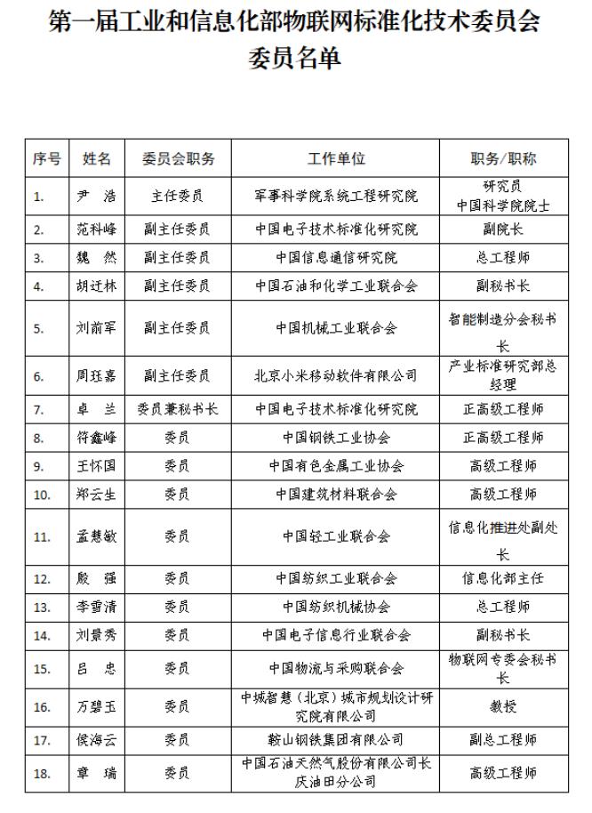 附件:第一屆工業(yè)和信息化部物聯(lián)網(wǎng)標(biāo)準(zhǔn)化技術(shù)委員會(huì)委員名單