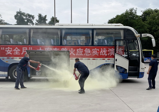 在演練時(shí),隨著滿載乘客的大客車行駛至劉電賓館門前,突然行李艙起火,大客車駕駛員在突然遇火險(xiǎn)緊急情況下,立即開啟應(yīng)急雙閃燈,靠邊停車,打開車門,迅速引導(dǎo)車內(nèi)乘客有序疏散,并要求大家用濕毛巾捂住口鼻,彎腰依次撤離到車外安全地帶。緊接著滅火組演練人員迅速行動起來,熟練地取出車載滅火器,拔下滅火器安全銷,用噴口對準(zhǔn)火源根部,及時(shí)將火撲滅,救護(hù)組及時(shí)疏散和救援下車人員,并對傷員身體狀況進(jìn)行基本護(hù)理和檢查。整個(gè)演練過程既緊張,又有條不紊,進(jìn)一步增強(qiáng)了全體員工的安全意識,真正掌握了交通工具突發(fā)火險(xiǎn)后迅速逃生、自救、互救的基本方法,達(dá)到了演練的預(yù)期目的。