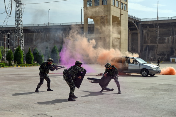 此次演練模擬恐怖分子挾持施工單位車輛,偽裝成施工人員在上班高峰期混入生產(chǎn)區(qū)域,并攜帶爆炸物意圖對(duì)大壩、330千伏開關(guān)站等重點(diǎn)部位實(shí)施爆炸破壞,在尋找時(shí)機(jī)實(shí)施破壞活動(dòng)時(shí)被該廠測(cè)溫人員發(fā)現(xiàn),在上前詢問、檢查證件時(shí)恐怖分子身份暴露,隨后挾持測(cè)溫人員,強(qiáng)行進(jìn)行爆炸破壞活動(dòng),最終被駐廠武警戰(zhàn)士和縣公安局防爆警察制服并成功解救被挾持人質(zhì)為場(chǎng)景。