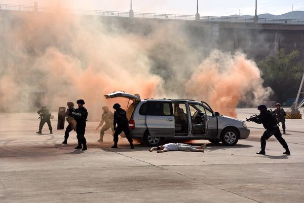 刺耳的警笛響起,縣公安局、縣消防救援大隊(duì)、醫(yī)療救援機(jī)構(gòu)車輛疾馳趕往事發(fā)地點(diǎn),3名恐怖分子與武警戰(zhàn)士、防暴警察展開對(duì)峙。