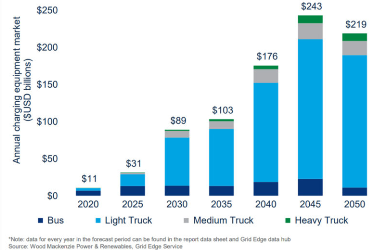 伍德·麥肯齊(Wood Mackenzie)近日發(fā)布的一份報(bào)告顯示,預(yù)計(jì)到2045年,電動(dòng)汽車(chē)充電基礎(chǔ)設(shè)施市場(chǎng)規(guī)模將達(dá)到2430億美元,而在隨后的五年中,電動(dòng)汽車(chē)充電基礎(chǔ)設(shè)施的市場(chǎng)規(guī)模將下降近250億美元,降至2190億美元。
