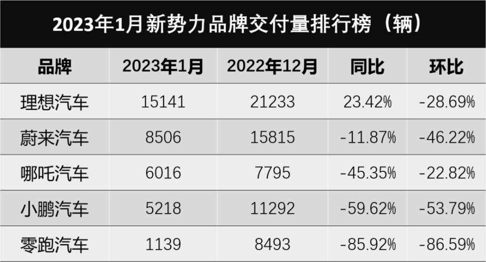或許是春節(jié)前后家庭用車需求的刺激,理想成為了2023年首月新勢(shì)力車企的大贏家,1月份雖說(shuō)各家交付量都受長(zhǎng)假影響下跌,但“大家都跌就意味著我沒(méi)跌”,尤其是身為新勢(shì)力銷冠的理想汽車,節(jié)后返工說(shuō)話底氣都更充足了。