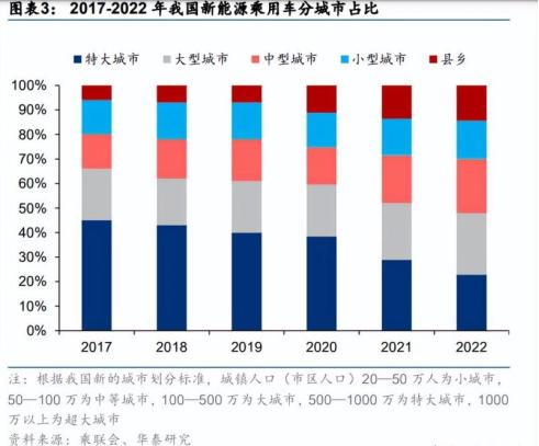 前述華泰報(bào)告顯示,當(dāng)前我國縣鄉(xiāng)地區(qū)占整體新能源車市場(chǎng)的比重較低,與全國平均水平有巨大差距,與特大城市及大型城市更是有巨大鴻溝。