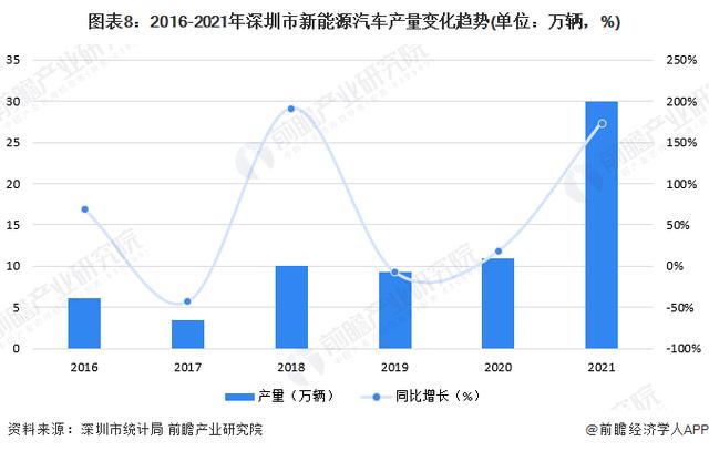 近年來,深圳市新能源汽車產業(yè)發(fā)展迅猛。2018-2020年,深圳市新能源汽車產量維持在9萬輛/年以上,2020年突破了10萬輛;2021年,深圳市新能源汽車產量逼近30萬輛,同比增長174%;同時,在新能源汽車的有效推廣下,全市公交出租均已實現(xiàn)電動化,2021年全市新能源汽車銷量14.48萬輛,占當年汽車銷量比重超40%。