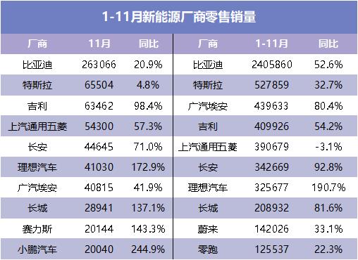 具體到細(xì)分品牌,新能源汽車今年前11個(gè)月銷量排名前三的品牌分別是比亞迪、特斯拉和廣汽埃安。