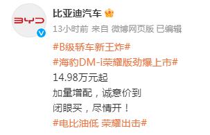 2月29日,比亞迪再出“王炸”。當(dāng)天,比亞迪汽車發(fā)布微博稱,宋PLUS DM-i榮耀版12.98萬—16.98萬元;宋PLUS EV榮耀版14.98萬—18.98萬元。同時,比亞迪還推出B級轎車“新王炸”——海豹DM-i榮耀版勁爆上市,14.98萬元起。