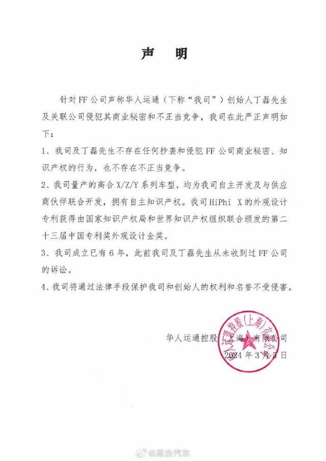 3月5日,就Faraday Future(法拉第未來,以下簡(jiǎn)稱“FF汽車”)對(duì)華人運(yùn)通高合汽車創(chuàng)始人丁磊及關(guān)聯(lián)公司的起訴,高合汽車方面發(fā)布聲明稱,該司及丁磊不存在任何抄襲和侵犯FF公司商業(yè)秘密、知識(shí)產(chǎn)權(quán)的行為,也不存在不正當(dāng)競(jìng)爭(zhēng)。