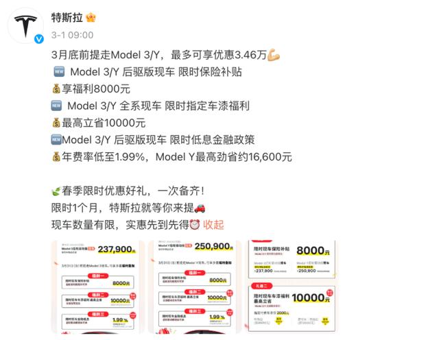 3月1日,特斯拉宣布Model 3、Model Y限時(shí)特惠,3月底前提走M(jìn)odel 3/Y,最多可享優(yōu)惠3.46萬(wàn)。本次特斯拉降價(jià)頗為低調(diào),沒(méi)有直接調(diào)降車(chē)價(jià),而是以保險(xiǎn)補(bǔ)貼、車(chē)漆福利等名目促銷(xiāo)。Model 3后驅(qū)版新車(chē)價(jià)245900元,保險(xiǎn)補(bǔ)貼后低至237900元。Model Y后驅(qū)版新車(chē)價(jià)258900元,保險(xiǎn)補(bǔ)貼后低至250900元。