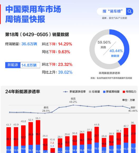 深入到2024年第18周的銷售細節(jié),即4月29日至5月5日這一時間段,我們發(fā)現(xiàn)中國汽車市場整體銷量為36.6萬輛,相較之前呈現(xiàn)出一定的下滑趨勢。其中,新能源汽車的銷量為14.8萬輛,盡管與去年同期相比仍實現(xiàn)了近40%的顯著增長,但與之前幾周相比,卻出現(xiàn)了環(huán)比下滑的態(tài)勢?;谶@些數(shù)據(jù),我們可以清晰地看到,該周新能源汽車在中國市場的滲透率為40.44%。