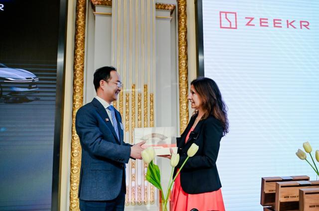 圖四:安聰慧代表極氪與紐交所主席互換上市紀(jì)念禮物