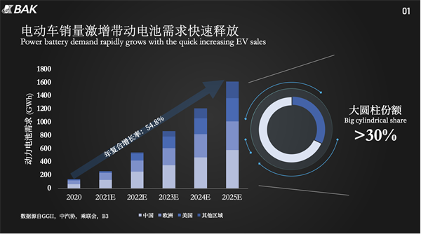 根據(jù)行業(yè)研究機(jī)構(gòu)EVTank統(tǒng)計(jì),2023年全球新能源汽車銷量達(dá)到1465.3萬(wàn)輛,同比增長(zhǎng)35.4%。新能源汽車銷量的激增,也帶動(dòng)了動(dòng)力電池需求的快速釋放。行業(yè)機(jī)構(gòu)預(yù)測(cè),到2025年,全球新能源汽車市場(chǎng)對(duì)動(dòng)力電池的需求量將達(dá)1600GWh,自2020年到2025年的年復(fù)合增長(zhǎng)率為54.8%。
