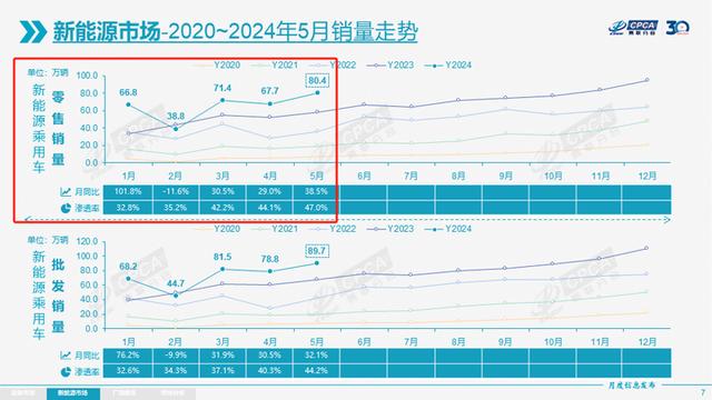 據(jù)乘聯(lián)會數(shù)據(jù),5月新能源車國內(nèi)零售滲透率達(dá)到47.0%,較去年同期33%的滲透率大幅提升了14個百分點。