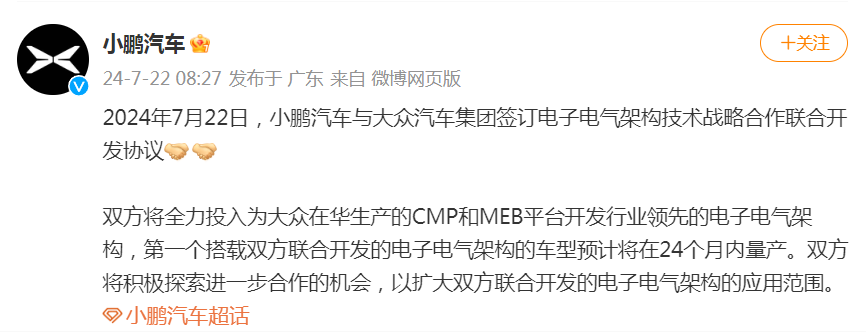 根據(jù)小鵬汽車公告,在上述合作中,小鵬汽車與大眾汽車集團(tuán)在廣州和合肥建立了聯(lián)合開(kāi)發(fā)項(xiàng)目組。