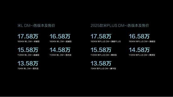 昨晚,搭載比亞迪第五代DM技術(shù)的宋L DM-i及2025款宋PLUS DM-i正式上市。兩款新車各推出5個(gè)版本,官方指導(dǎo)價(jià)均為13.58萬(wàn)-17.58萬(wàn)元。