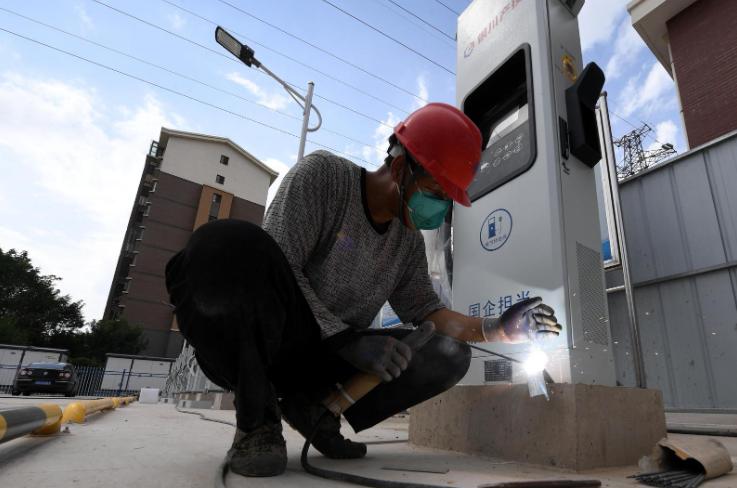 8月15日,在湖畔嘉苑麗景苑東北角停車場新能源汽車充電樁城市基礎(chǔ)配套設(shè)施停車場,施工人員正對45個充電樁進(jìn)行最后的安裝調(diào)試。