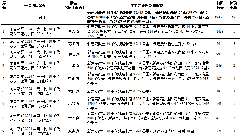 項(xiàng)目包含9個(gè)子項(xiàng)目(合計(jì)27個(gè)孫項(xiàng)目),新建及改造長(zhǎng)72.413公里的10千伏線路,新建及改造39個(gè)配變臺(tái)區(qū),新建及改造1臺(tái)環(huán)網(wǎng)柜,新建及改造255臺(tái)柱上開關(guān),新建及改造長(zhǎng)53.955公里的0.4千伏線路。