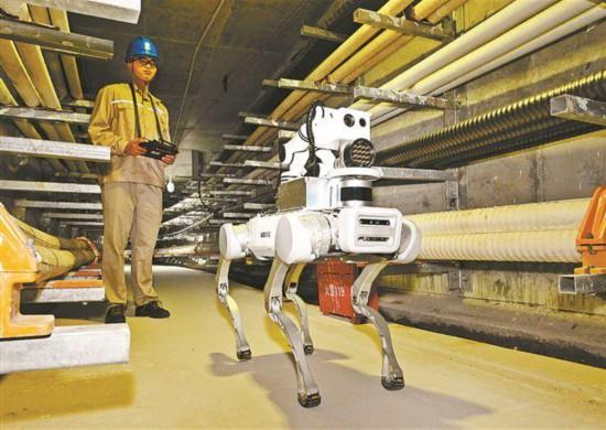 在廈門翔安海底電纜隧道內(nèi),搭載高清攝像頭、紅外熱像儀等智能傳感器的機器狗開展電纜巡檢。
