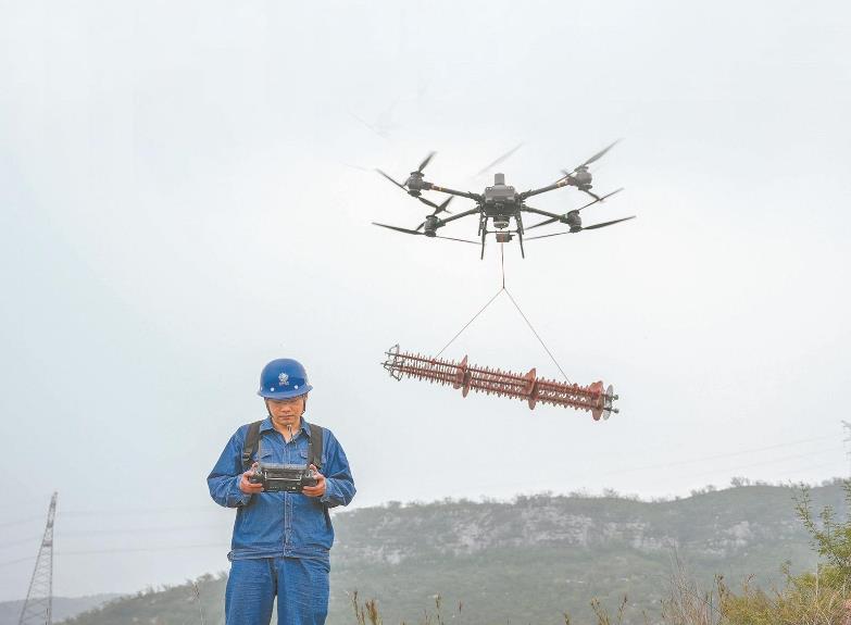 柔性攻關(guān)創(chuàng)新團(tuán)隊(duì)成員應(yīng)用改造后的重載無人機(jī)將合成絕緣子串送至220千伏梁柏Ⅰ線檢修現(xiàn)場。