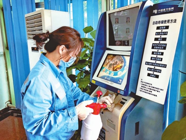 連日來,廣東電網(wǎng)公司江門臺(tái)山供電局組織員工對(duì)營(yíng)業(yè)廳、辦公場(chǎng)所和車輛進(jìn)行全面清潔消毒,做好防疫后勤保障工作。謝錕 攝