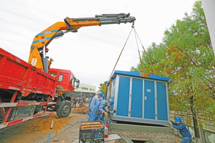 2月6日12時(shí)30分,中山市第二人民醫(yī)院臨時(shí)防疫病房全部通電!接到該擴(kuò)建工程配套電氣設(shè)備及增容用電的任務(wù),廣東電網(wǎng)公司中山供電局僅用6天時(shí)間便全部完工,比原計(jì)劃提前6天,為醫(yī)院建設(shè)提供了堅(jiān)強(qiáng)電力保障。圖為施工人員正在吊裝變壓器箱,為通電做好設(shè)備調(diào)試工作。 譚茂茜 攝