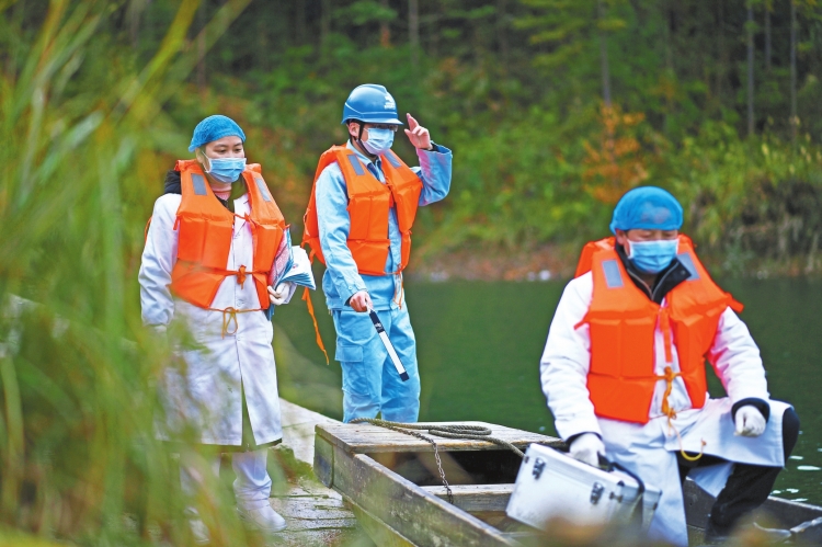2月8日,在臺(tái)江縣革一鎮(zhèn)排生村,臺(tái)江供電局臺(tái)盤供電所黨員王清亮和當(dāng)?shù)匦l(wèi)生部門工作人員乘船前往工作點(diǎn)?!㈤_福 攝影報(bào)道