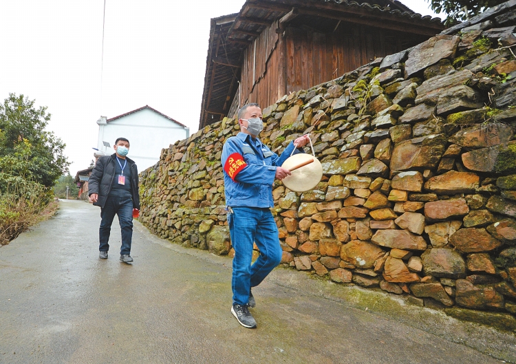 2月5日,貴州省黔東南苗族侗族自治州三穗縣八弓鎮(zhèn)高寨村響洞寨,貴州電網(wǎng)公司凱里三穗供電局駐高寨村幫扶干部羅德杰(右一)和村委干部一同,一個(gè)負(fù)責(zé)敲鑼,一個(gè)負(fù)責(zé)提著播放器,穿梭于寨子里,向村民宣傳防疫知識(shí)。 萬明忠 攝