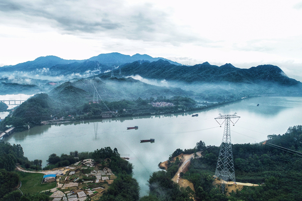 南方電網(wǎng)已形成“八交十一直”西電東送大通道,送電能力達(dá)到5800萬千瓦,五年累計(jì)送電量達(dá)到1.07萬億度。圖為昆柳龍直流工程廣東段線路跨越清遠(yuǎn)北江。