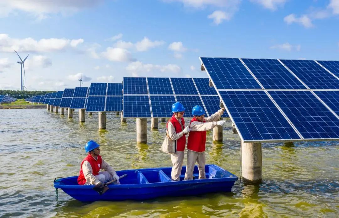 ▲國網(wǎng)江蘇南通供電公司員工在“漁光互補”光伏電站巡檢光伏發(fā)電設備。