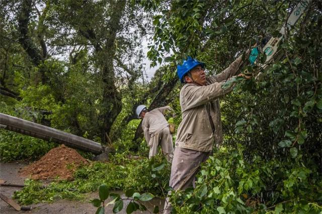 國(guó)網(wǎng)福建泉州惠安供電公司員工在被大風(fēng)壓斷的10千伏虎窟線電桿旁緊急清理樹(shù)木障礙。