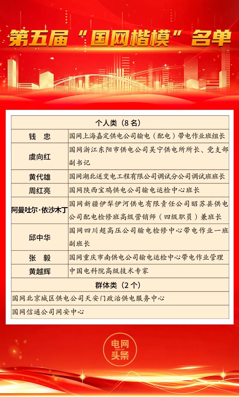 為深入學(xué)習(xí)貫徹習(xí)近平總書記關(guān)于黨的建設(shè)的重要思想和習(xí)近平文化思想,認(rèn)真落實(shí)學(xué)習(xí)貫徹習(xí)近平新時(shí)代中國特色社會(huì)主義思想主題教育關(guān)于“學(xué)習(xí)身邊榜樣”活動(dòng)要求,充分發(fā)揮先進(jìn)典型示范引領(lǐng)作用,大力弘揚(yáng)電力精神和電網(wǎng)鐵軍精神,凝聚推動(dòng)公司“一體四翼”高質(zhì)量發(fā)展的強(qiáng)大合力,根據(jù)公司黨組統(tǒng)一部署,按照年度表彰計(jì)劃,公司組織開展了第五屆“國網(wǎng)楷模”評(píng)選活動(dòng),與第四屆“國網(wǎng)楷模”以及“最美國網(wǎng)人”一并發(fā)布。在各單位培育選樹、逐級(jí)推薦的基礎(chǔ)上,經(jīng)資格審查、聯(lián)評(píng)投票、專家評(píng)審及公示等環(huán)節(jié),公司黨組研究決定,授予宰紅斌等8名同志和國網(wǎng)天津電力“大山里行走的紅馬甲”青年志愿服務(wù)隊(duì)等2個(gè)群體第四屆“國網(wǎng)楷模”榮譽(yù)稱號(hào),授予錢忠等8名同志和國網(wǎng)北京城區(qū)供電公司天安門政治供電服務(wù)中心等2個(gè)群體第五屆“國網(wǎng)楷模”榮譽(yù)稱號(hào),授予曾兵等86名同志“最美國網(wǎng)人”榮譽(yù)稱號(hào)。