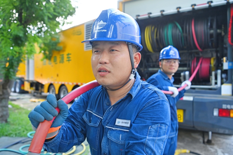 國網(wǎng)陜西寶雞供電公司員工為受汛情影響小區(qū)接通發(fā)電車。