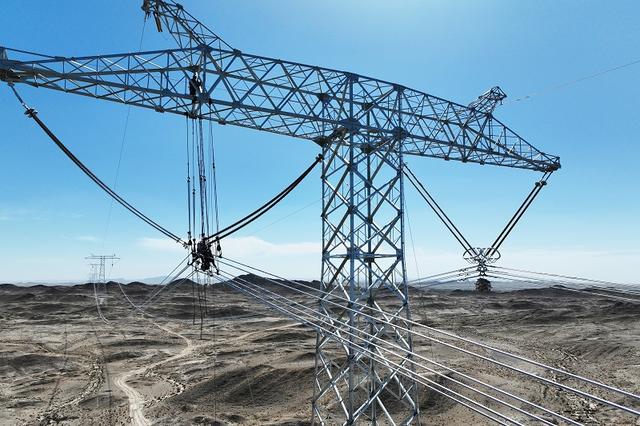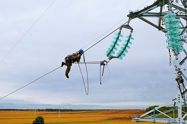 國(guó)網(wǎng)甘肅電力施工人員在哈密—重慶±800千伏特高壓直流輸電工程開展架線自檢。