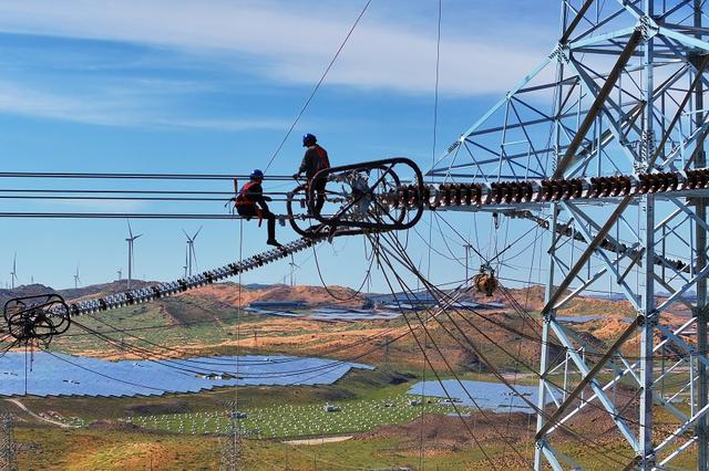 國(guó)網(wǎng)寧夏送變電公司施工人員在寧夏—湖南±800千伏特高壓直流輸電工程進(jìn)行平衡掛線作業(yè)。