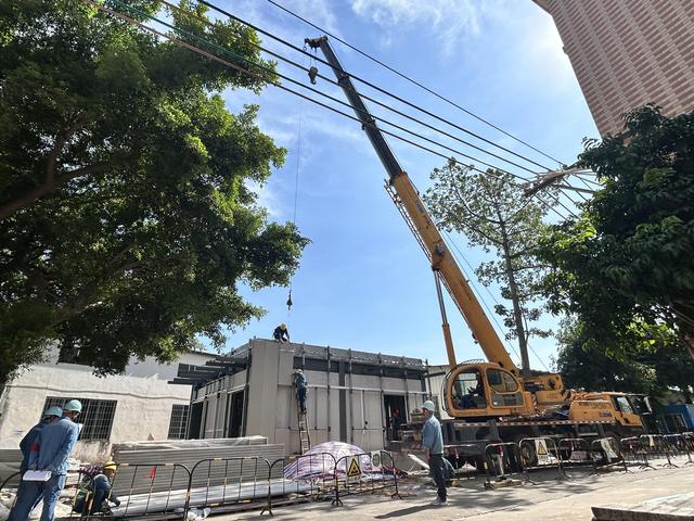在施工技術(shù)上,江門(mén)蓬江供電局不僅引入了自動(dòng)化挖掘機(jī)、起重機(jī)、混凝土攪拌車(chē)等機(jī)械,還摒棄傳統(tǒng)配電站的磚瓦結(jié)構(gòu),采用高強(qiáng)度、輕質(zhì)、耐腐蝕的成品預(yù)制墻板及鋼結(jié)構(gòu)等新型建筑材料,結(jié)合裝配式施工工藝,減少以往現(xiàn)場(chǎng)焊接、切割等工藝帶來(lái)的環(huán)境污染,大大縮短了施工周期,還減少建筑垃圾的產(chǎn)生。“與傳統(tǒng)純?nèi)斯な┕し绞较啾?,本工程機(jī)械化率達(dá)到85%,工期壓縮了80%,大大減少了對(duì)附近居民的影響,也降低了施工過(guò)程中的安全隱患。”羅益榮說(shuō)。