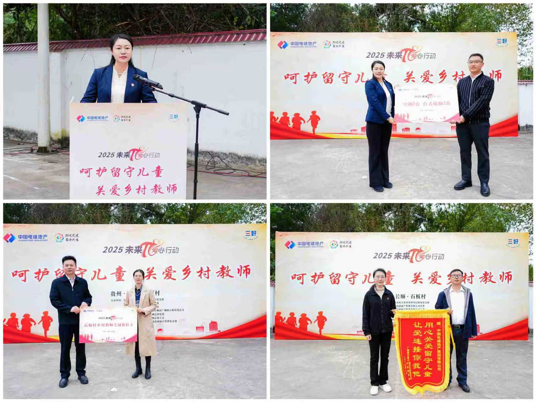10月22日,中國電建地產(chǎn)聯(lián)合貴州省機(jī)關(guān)事務(wù)管理局,在貴州黔南布依族苗族自治州長順縣廣順鎮(zhèn)石板村黨群服務(wù)中心,開展第三次“未來π”愛心行動。貴州省機(jī)關(guān)事務(wù)管理局黨組成員、副局長李文華,中國電建地產(chǎn)黨委副書記、工會主席武琳等出席活動,在石板村為師生、鄉(xiāng)親們傳遞溫暖與希望。