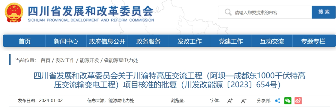 據(jù)四川省發(fā)改委網(wǎng)站1月2日消息,國網(wǎng)四川省電力公司川渝特高壓交流工程(阿壩—成都東1000千伏特高壓交流輸變電工程)獲四川省發(fā)改委核準批復。