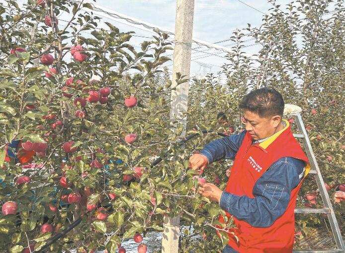 國家電網(wǎng)陜西電力張思德(延安棗園)共產(chǎn)黨員服務(wù)隊(duì)隊(duì)員幫助農(nóng)民采摘蘋果。許娜 攝