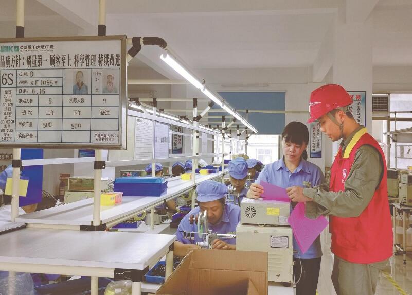 黨員服務(wù)隊(duì)隊(duì)員來到湖北榮浩電子有限公司,為流水線上的工人講解安全用電知識。程建僑 攝
