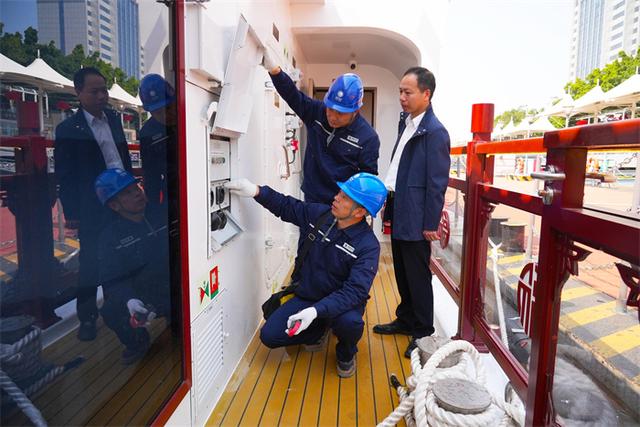 為確保首航成功,當(dāng)天國(guó)網(wǎng)福州供電公司臺(tái)江政企服務(wù)班的工作人員提前到達(dá)現(xiàn)場(chǎng)對(duì)游輪的岸電系統(tǒng)進(jìn)行義務(wù)檢查,確保其可靠運(yùn)行。