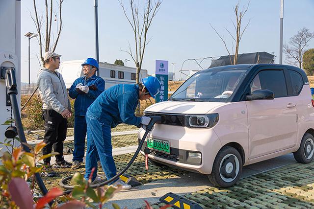 國(guó)網(wǎng)馬鞍山供電公司員工在和縣善厚鎮(zhèn)半月湖電動(dòng)汽車(chē)充電站為車(chē)主解答充電疑問(wèn)。高孫浩攝