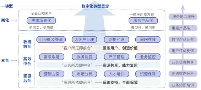 以“三臺兩化一轉(zhuǎn)型”為抓手,全面推進(jìn)現(xiàn)代供電服務(wù)體系建設(shè),不斷優(yōu)化前、中、后臺協(xié)同運作機(jī)制,暢通企業(yè)內(nèi)循環(huán)。實體化中臺建設(shè)穩(wěn)步推進(jìn),“基礎(chǔ)+增值”用電服務(wù)產(chǎn)品不斷豐富,服務(wù)效率不斷提升、用戶獲得感、幸福感和安全感不斷增強。