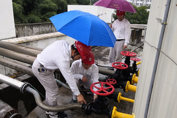 圖為檢查小組正在檢查油罐進(jìn)回油管法蘭盤靜電跨接線情況