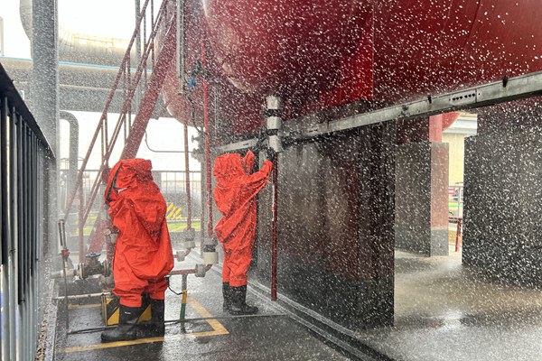 本次演練模擬該公司輔控人員巡檢過(guò)程中發(fā)現(xiàn)1號(hào)鹽酸罐出口管泄露,有大量的酸霧冒出,并立即匯報(bào)當(dāng)班值長(zhǎng),值長(zhǎng)確定人員及鹽酸泄漏情況后啟動(dòng)鹽酸泄漏事故應(yīng)急處置預(yù)案。組織相關(guān)人員立即拉開(kāi)警戒線,參與演練的員工著防酸服等防護(hù)用品進(jìn)入現(xiàn)場(chǎng),對(duì)鹽酸泄漏點(diǎn)進(jìn)行現(xiàn)場(chǎng)搶修、隔離,消防隊(duì)員用消防水槍噴水霧壓制現(xiàn)場(chǎng)酸霧,將含酸廢水引至酸堿廢水池進(jìn)行中和處理。演練過(guò)程緊張有序,順利完成。演練結(jié)束后,相關(guān)安全管理負(fù)責(zé)人結(jié)合現(xiàn)場(chǎng)情況,對(duì)此次應(yīng)急演練工作進(jìn)行了點(diǎn)評(píng),并與參演人員討論分析了各處置環(huán)節(jié)的不足之處和改進(jìn)建議。
