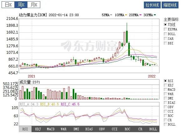 2022年1月14日,動(dòng)力煤主力合約2205開盤于689元/噸,最高價(jià)695.6元/噸,最低價(jià)683.8元/噸,收盤于692.4元/噸,較上一交易日下跌8.6,跌幅1.23%,成交量6928手,持倉(cāng)量27976手,日減倉(cāng)356手。