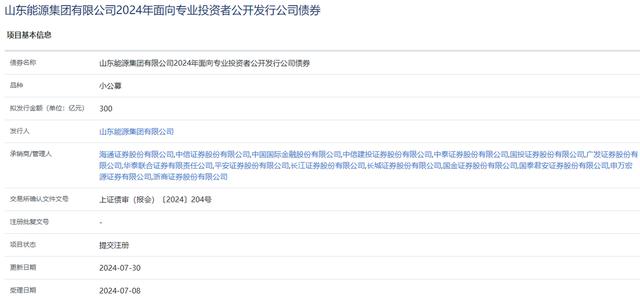 上交所債券項(xiàng)目信息平臺顯示,山東能源集團(tuán)有限公司2024年面向?qū)I(yè)投資者公開發(fā)行公司債券項(xiàng)目,最新的狀態(tài)為“提交注冊”,更新日期為2024年7月30日。