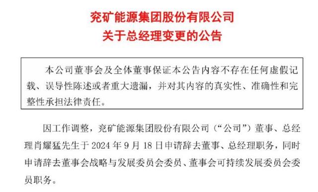 9月18日晚,兗礦能源(600188.SH)公告,因工作調(diào)整,公司董事、總經(jīng)理肖耀猛當天申請辭去董事、總經(jīng)理職務(wù),同時辭去董事會戰(zhàn)略與發(fā)展委員會委員、董事會可持續(xù)發(fā)展委員會委員職務(wù)。