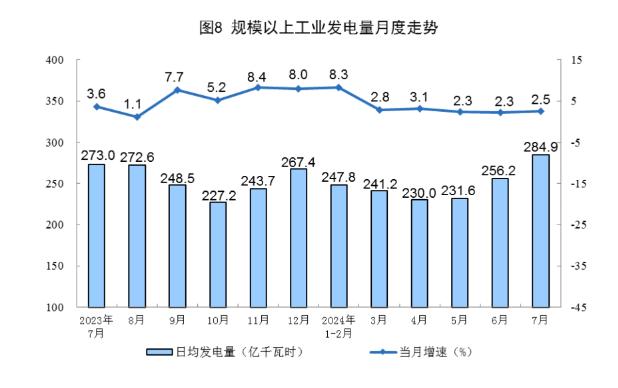 8月15日,國(guó)家統(tǒng)計(jì)局發(fā)布數(shù)據(jù)顯示,規(guī)模以上工業(yè)(以下簡(jiǎn)稱(chēng)“規(guī)上工業(yè)”)電力生產(chǎn)略有加快。7月,規(guī)上工業(yè)發(fā)電量8831億千瓦時(shí),同比增長(zhǎng)2.5%,增速比6月加快0.2個(gè)百分點(diǎn);規(guī)上工業(yè)日均發(fā)電284.9億千瓦時(shí)。1—7月,規(guī)上工業(yè)發(fā)電量53239億千瓦時(shí),同比增長(zhǎng)4.8%。