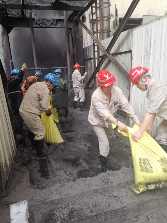 上午10時(shí),暴雨加劇,主機(jī)集控室開始大量漏水,吊頂部分塌落,下方的電子設(shè)備間漏水嚴(yán)重,部分參數(shù)失真;汽機(jī)房外的廠內(nèi)主路積水達(dá)50公分;煤溝進(jìn)水;廠前區(qū)全部停電、大門外波濤洶涌;墻外從山上下來的山洪更是濁浪排空。危急關(guān)頭,首陽山項(xiàng)目部20余名黨員干部職工積極參與防汛行動(dòng),用沙袋堵塞缺口,加固堤壩,險(xiǎn)情逐漸消除。17時(shí),首陽山發(fā)電公司運(yùn)煤通道路基塌方,燃煤運(yùn)輸中斷。險(xiǎn)情就是命令!面對(duì)只有兩天用量的煤炭庫存,項(xiàng)目部人員積極參與到首陽山發(fā)電公司抗洪搶險(xiǎn)隊(duì)伍中,共筑防汛抗洪“同心堤”。經(jīng)過連續(xù)八個(gè)小時(shí)團(tuán)結(jié)奮戰(zhàn),燃煤供應(yīng)線路逐步恢復(fù),大唐人抵抗住了偃師幾十年罕見的暴雨襲擊,為地方抗洪搶險(xiǎn)、保障城市安全電力貢獻(xiàn)了力量。